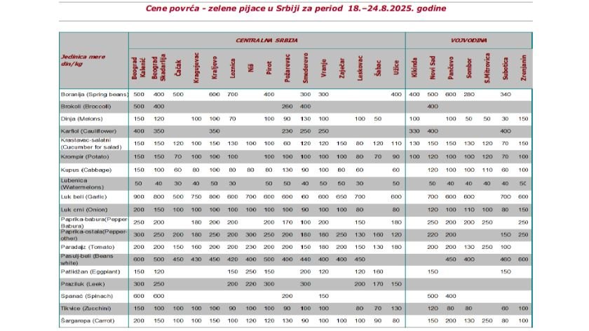 Po nižim su se cenama protekle sedmice mogli pazariti grožđe i šljiva. Sezona lubenice i dinje polako prolazi, pa je i ponuda slabija, što se odrazilo na rast cena. Skuplji su bili još paprika ljuta, paprika ostala, tikvice, zelena salata, šargarepa i kelj. Za razliku od njih jeftiniji su bili celer, krastavac salatar, mladi crni luk, paprika babura, paprika šilja i paradajz.