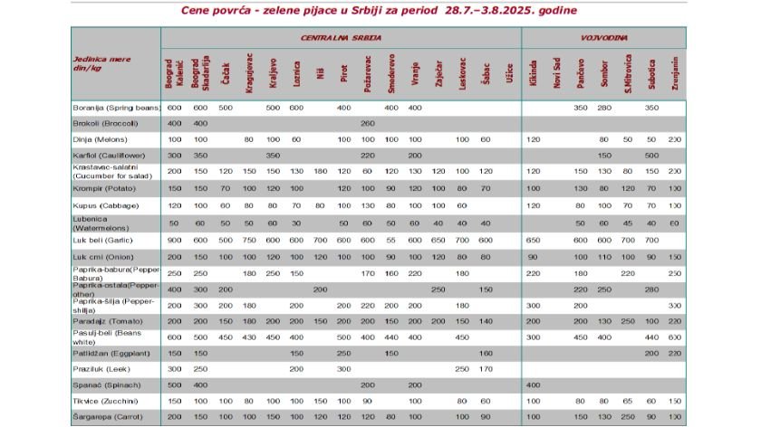 Cene voća i povrća na pijacama širom Srbije beleže promene — na kvantašima u Beogradu i Leskovcu zabeležen je pad cena brojnih sezonskih proizvoda, dok su na zelenim pijacama pojedine voćke i povrće poskupeli. Promene u ponudi i tražnji najviše su diktirane vremenskim prilikama i kretanjem broja kupaca.