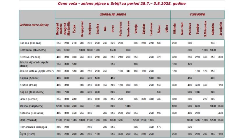Na kvantaškoj pijaci u Beogradu se još uvek mogu pazariti jagode po dominantnoj ceni od 500 din/kg i trešnje po dominantnoj ceni od 600 din/kg. Pad cena evidentiran je kod ribizle, borovnice, maline, kupine, kajsije, boranije, krastavca salatara, kupusa, dinje, lubenice, patlidžana, spanaća i tikvice.