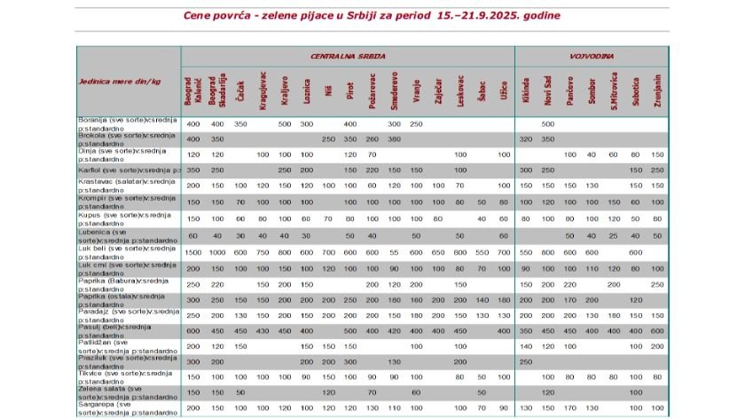 Na zelenoj pijaci u Kraljevu bila je slaba do prosečna ponuda voća i povrća tokom treće sedmice septembra. Mesec je pripreme tradicionalne zimnice, što je uticalo na bolju zainteresovanost kupaca i veći obim prodaje. U pogledu cena evidentiran je rast cena lubenice. Pad cena evidentiran je kod grožđa, kruške, pomorandže, šarene boranije, karfiola.