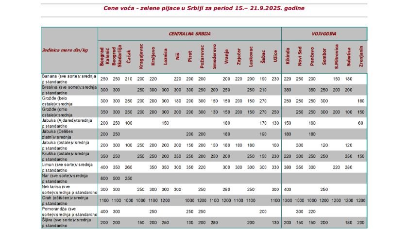 Proteklu sedmicu karakteriše bolja ponuda voća na kvantaškoj pijaci u Beogradu. Uprkos tome došlo je do rasta cena jabuke, banane, borovnice, breskve, limuna, maline, pomorandže, suve šljive. Za razliku od njih niže su bile cene mandarine, kivija, nara i oraha.