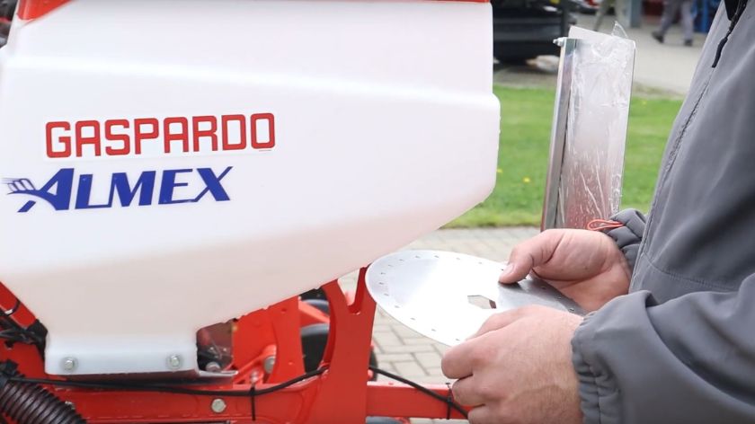 Postavljanje setvene ploče zavisi od kulture koja se seje, a kako kaže Andrej, na Gaspardo Magica sejalici je jednostavno: ,,Trenutno držim u ruci ploču od 26 rupa sa Ø 4,5 mm rupama koja služi za setvu kukuruza. Ona se postavlja jednostavno. Deo koji ima na sebi zube ide unutra i on služi za pokretanje, za mešanje semena da se ne slegne. Ona kad se postavi i upadne unutra, pristupamo zatvaranju aparata”.